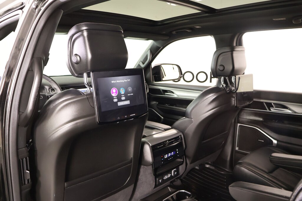 THIS VEHICLE COMES EQUIPPED WITH THE FOLLOWING OPTIONS AND FEATURES: Carbide Appearance Package, Flexible Seating Group (60/40 Power Recline 3rd Row Seat, 7-Passenger Seating, Floor Console w/Cupholder, and Power Tip/Slide Recline 2nd Row Buckets), Quick Order Package 25F Carbide (3 Panel Sunroof, Adjustable Roof Rail Crossbars, Black Interior Accents, Cargo Cover, Piano Black Exterior Accents, Reversible Carpet/Vinyl Cargo Mat, and Wheels: 20" x 9" Gloss Black Painted Aluminum), Rear Seat Video Group 1 (Amazon Fire TV Built-In, Seatback Video Screens, and Video USB Port), 10 Speakers, Auto-leveling suspension, Exterior Parking Camera Rear, Four wheel independent suspension, Fully automatic headlights, Heated front seats, Heated steering wheel, Navigation System, Normal Duty Suspension, Power Liftgate, Radio: Uconnect 5 Nav w/10.1" Display, Ventilated front seats, 3.55 Rear Axle Ratio, 3rd row seats: bench, 4-Wheel Disc Brakes, ABS brakes, Adjustable pedals, Air Conditioning, Alloy wheels, AM/FM radio: SiriusXM with 360L, Anti-whiplash front head restraints, Audio memory, Auto-dimming door mirrors, Auto-dimming Rear-View mirror, Automatic temperature control, Brake assist, Bumpers: body-color, Compass, Delay-off headlights, Driver door bin, Driver vanity mirror, Driver's Seat Mounted Armrest, Dual front impact airbags, Dual front side impact airbags, Electronic Stability Control, Emergency communication system: Automatic SOS Call, Front anti-roll bar, Front Bucket Seats, Front Center Armrest w/Storage, Front dual zone A/C, Front fog lights, Front reading lights, Garage door transmitter, Genuine wood console insert, Genuine wood dashboard insert, Genuine wood door panel insert, Heated door mirrors, Illuminated entry, Knee airbag, Leather Trimmed Bucket Seats, Low tire pressure warning, Memory seat, Occupant sensing airbag, Outside temperature display, Overhead airbag, Overhead console, Panic alarm, Passenger door bin, Passenger seat mounted armrest, Passenger vanity mirror, Pedal memory, Power adjustable front head restraints, Power door mirrors, Power driver seat, Power passenger seat, Power steering, Power windows, Radio data system, Rain sensing wipers, Rear air conditioning, Rear anti-roll bar, Rear dual zone A/C, Rear reading lights, Rear seat center armrest, Rear window defroster, Rear window wiper, Reclining 3rd row seat, Remote keyless entry, Security system, Speed control, Speed-sensing steering, Speed-Sensitive Wipers, Split folding rear seat, Steering wheel memory, Steering wheel mounted audio controls, Tachometer, T